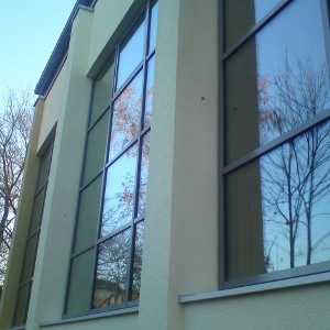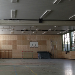 Die Sanierung der Turnhalle beinhaltet neben der Wiederherstellung der Dachkonstruktion als Stahl-Alu- Flachdach die energetische Sanierung der Fassaden, Außentüren und Hallenfenster als Pfosten Riegelkonstruktion mit Rauchabzugssteuerung sowie den kompletten Innenausbau.
